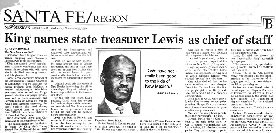 In honor of former New Mexico State Treasurer James B. Lewis – leader, pioneer, and trailblazer – whose nearly 50 years as a dedicated public servant has greatly shaped our community. He originally served as New Mexico State Treasurer from 1985 to 1990; then again in 2006, serving two consecutive terms until 2014. He was the first African American to serve in that role.