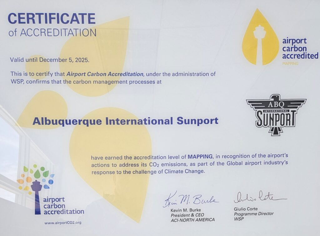 The Albuquerque International Sunport is committed to being as sustainable as possible. As of December 5th, 2023, the Sunport has been awarded its Level 1 Airport Carbon Accreditation (ACA). This accreditation is globally recognized with 27 airports in North America currently accredited at Level 1. This effort required the Sunport to establish a baseline greenhouse gas emissions inventory as well as publicly posting a Carbon Policy Statement (see link at top of page). Developing our GHG emissions inventory involved extensive research into the Sunport’s utility usage including electric, natural gas, generator and boiler consumptions along with several other facility operations. All of which was required to have an independent verifier review for accuracy. If you would like more information regarding Airport Carbon Accreditation, please click on the following link www.airportcarbonaccreditation.org